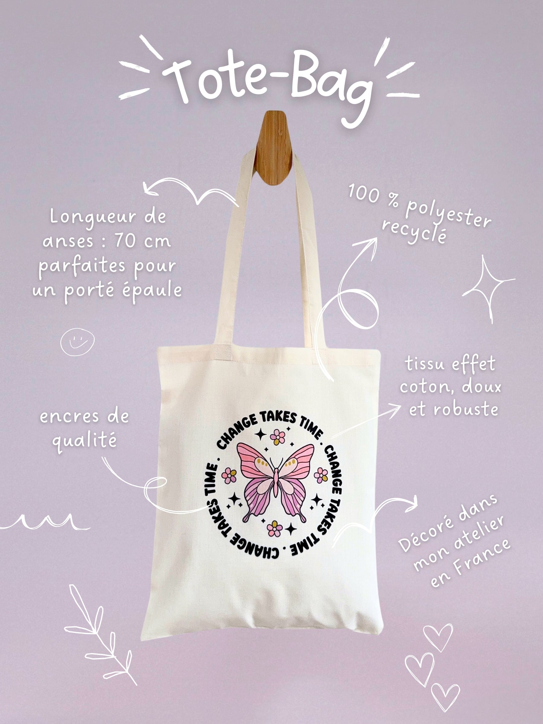 Fabriqué en polyester recyclé et décoré avec soin dans notre atelier, ce tote-bag est léger, résistant et conçu pour t’accompagner partout. Son design girly et coloré ajoute une touche de fun à toutes tes sorties.